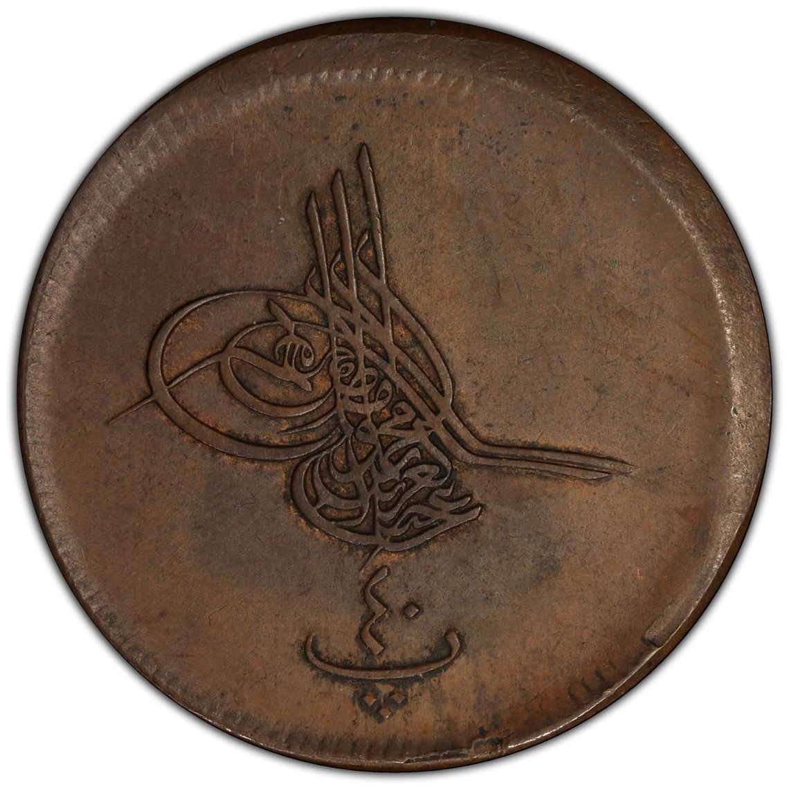 This 40 Para copper coin, dated AH 1277/10 (AD 1869), was minted under Ottoman Sultan Abdulaziz. Due to a broadstruck error, the planchet expanded, giving the coin a larger diameter and misaligned design. Graded PCGS AU Details, it shows significant detail while highlighting the minting mishap. Catalogued as KM‑248.1, this error coin combines historic context with numismatic intrigue.